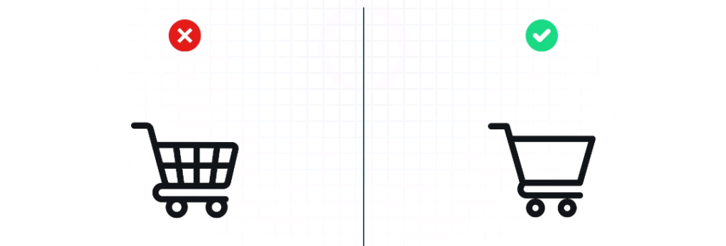 Los iconos excesivamente detallados tienden a ser visualmente densos, lo que los hace difíciles de interpretar, especialmente en dispositivos móviles o pantallas pequeñas. Un buen ejemplo es el icono de un carrito de compras: agregar demasiados elementos como ruedas, sombras o productos dentro del carrito puede confundir al usuario y restar claridad a su significado. En cambio, una representación sencilla, con líneas limpias y sin adornos innecesarios, resulta mucho más eficaz y directa.