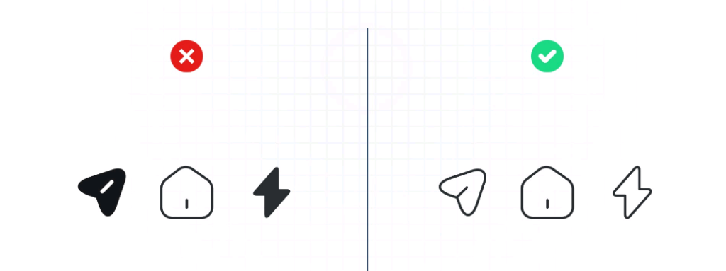 Cuando los iconos de un proyecto tienen estilos diferentes —por ejemplo, líneas gruesas en un icono y delgadas en otro, o formas angulares mezcladas con formas curvas— se crea una ruptura en la armonía visual. Esta falta de cohesión puede resultar confusa para los usuarios y afectar la percepción de calidad del diseño. En cambio, cuando los iconos comparten proporciones, líneas y grosores similares, parecen formar parte de un todo, mejorando la usabilidad y profesionalismo de la interfaz.