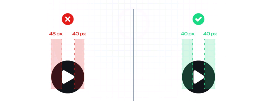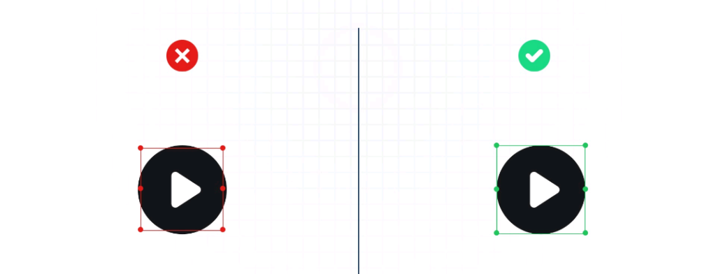 Por ejemplo, un icono de “play” que no esté centrado en su caja delimitadora puede parecer desubicado, creando un desbalance visual en la interfaz. Peor aún, si el icono sobresale de los bordes de la caja, podría recortarse al mostrarse en diferentes dispositivos o resoluciones. Para evitar estos problemas, es fundamental usar herramientas de diseño como cuadrículas y guías, que te permitan verificar que el icono esté perfectamente alineado y tenga suficiente espacio alrededor para “respirar”.