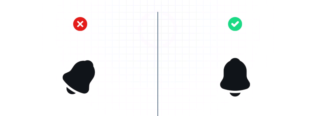 Como muestra la imagen, los iconos con orientación frontal presentan una forma clara y directa que evita distracciones visuales. Por ejemplo, un icono de campana para notificaciones debe estar diseñado con una vista frontal que muestre su silueta completa y bien definida. Si el mismo icono estuviera inclinado o con ángulos tridimensionales, podría perder parte de su significado, confundiendo a los usuarios, especialmente cuando se muestra en tamaños pequeños o junto a otros iconos.
